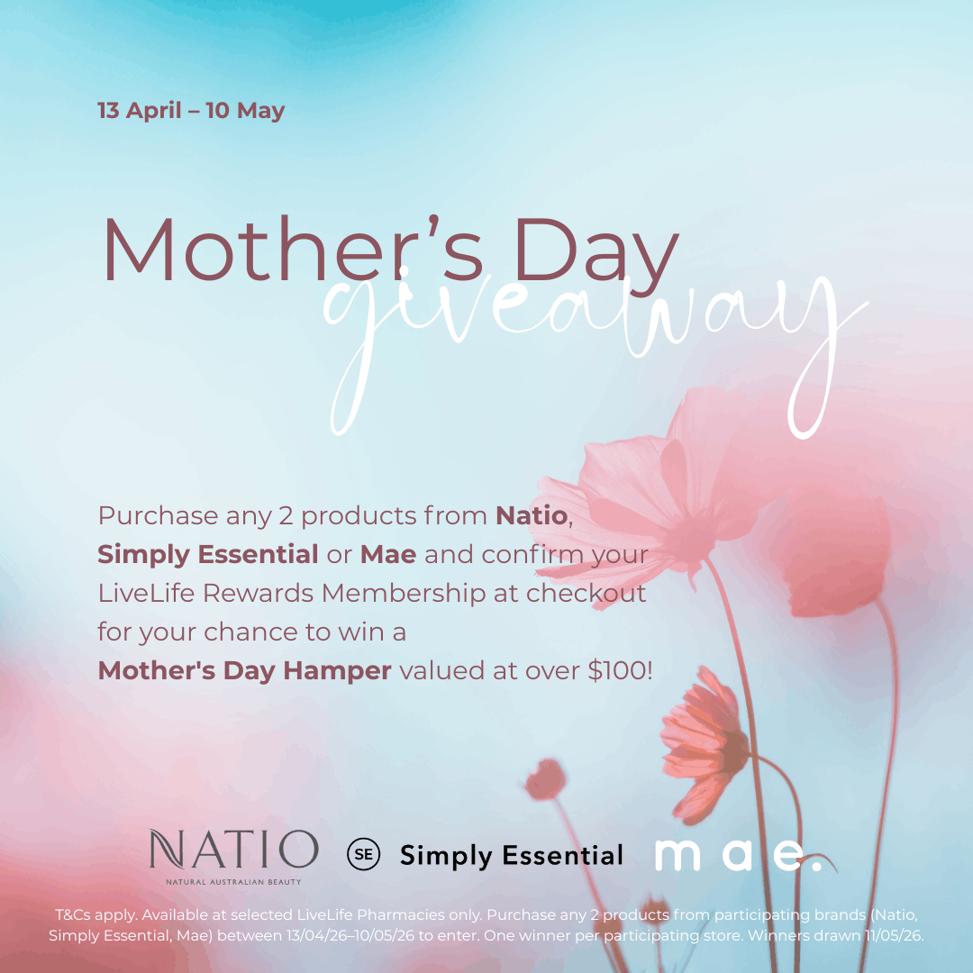 To celebrate Mother’s Day, we’re giving you the chance to win a Mother’s Day Hamper valued at over $100. From 13 April to 10 May, purchase any two products from Natio, Simply Essential or Mae in a single transaction and confirm your LiveLife Rewards membership at checkout to go into the draw. It’s that easy!